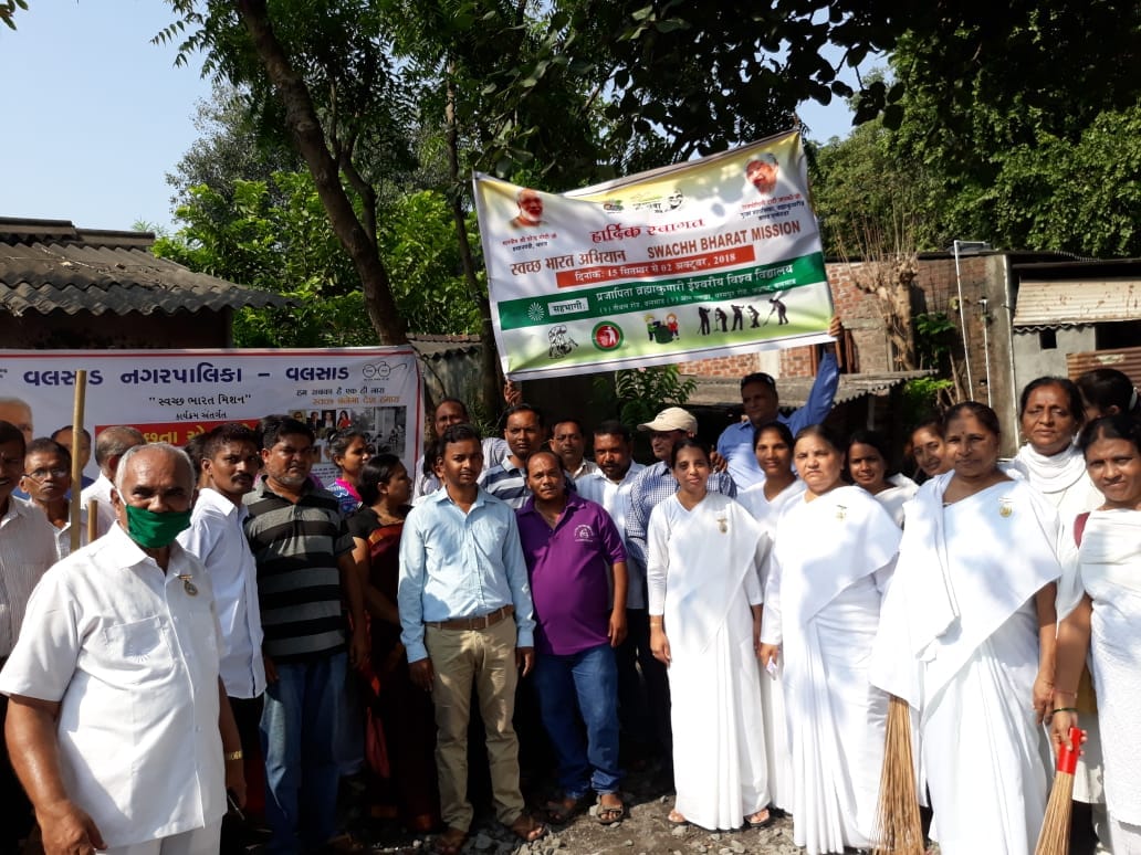 Swacch (Clean) Bharat campaign was run in Valsad, Gujarat by Brahma Kumaris in which he President of the Municipality, Vice President of Municipality and Municipality Staff also participated in the campaign. This drive was carried out in the Abrama area of the town where 40 BK volunteers cleaned the slums under the leadership of Center Incharge of Brahma Kumaris in Valsad, BK Ranjan and BK Rohit Kumar.